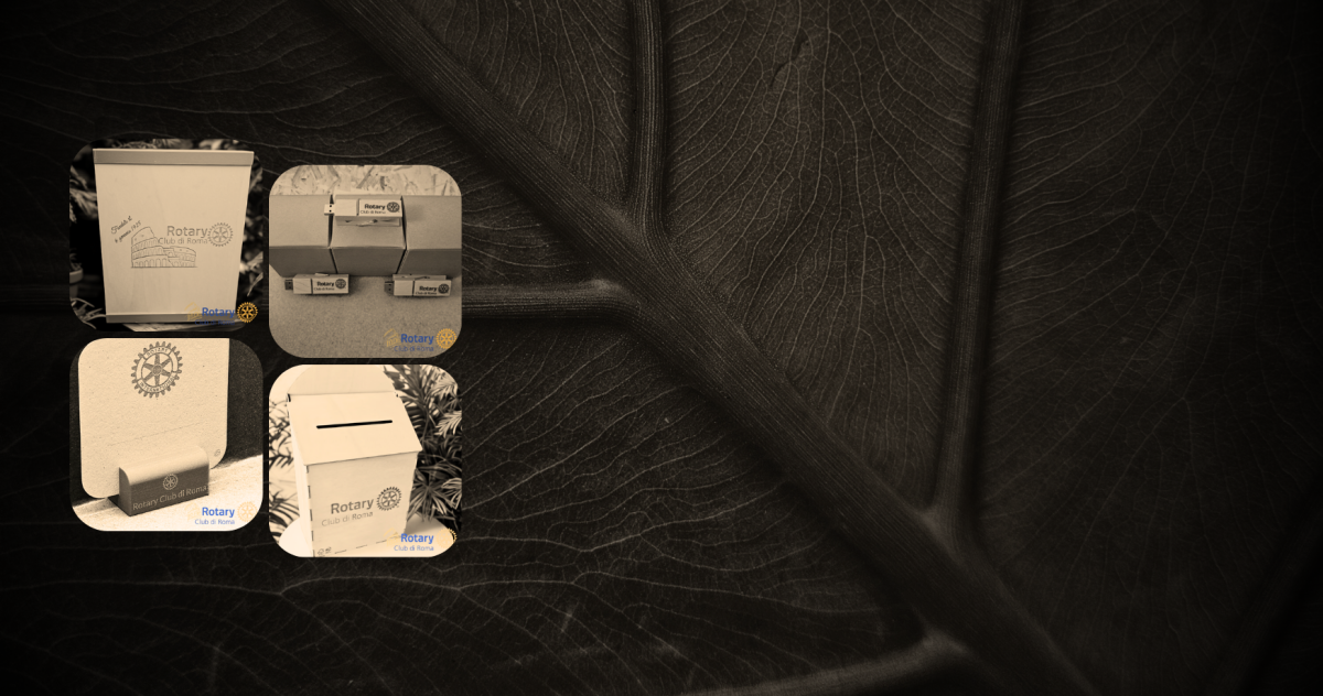 L2 x Rotary Club di Roma - Tavola per foglio firme; legno FSC/PEFC e plastica di canapa/ - gadget soci USB; legno certificato FSC/ - Segnaposto; plastica di canapa e carta riciclata/ - cassetta votazioni; legno certificato FSC/PEFC